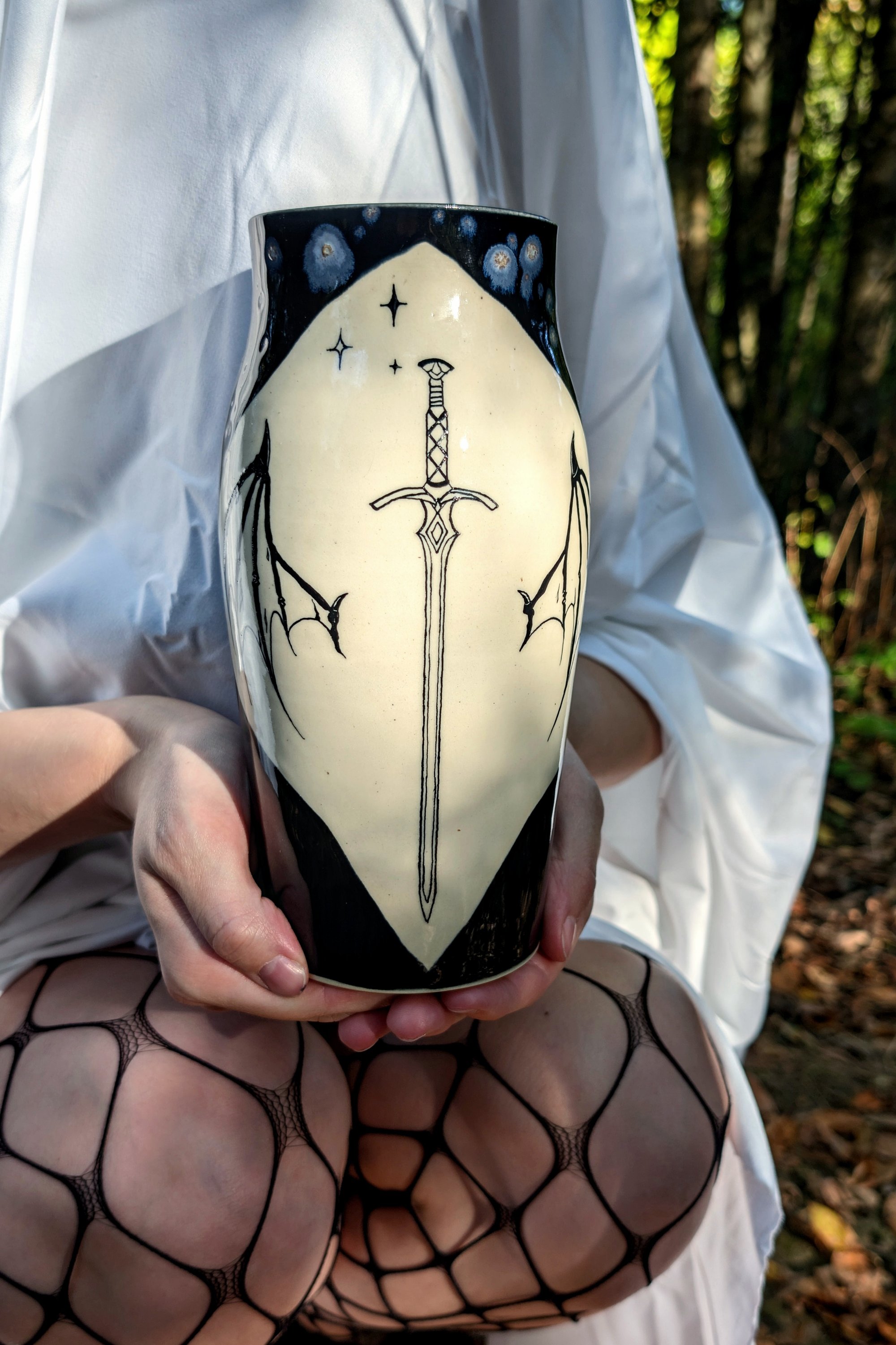 Medium vase with detailed, original hand drawn image of the bat boy wings, sword and 3 stars from the book series "A Court of Thorns and Roses" drawn directly onto the piece with a squeeze bottle of underglaze. Glazed glossy black around image with star bursts around the top half, and a black interior. Clear glaze was applied over the image after the initial firing. One of one, and completely niche.