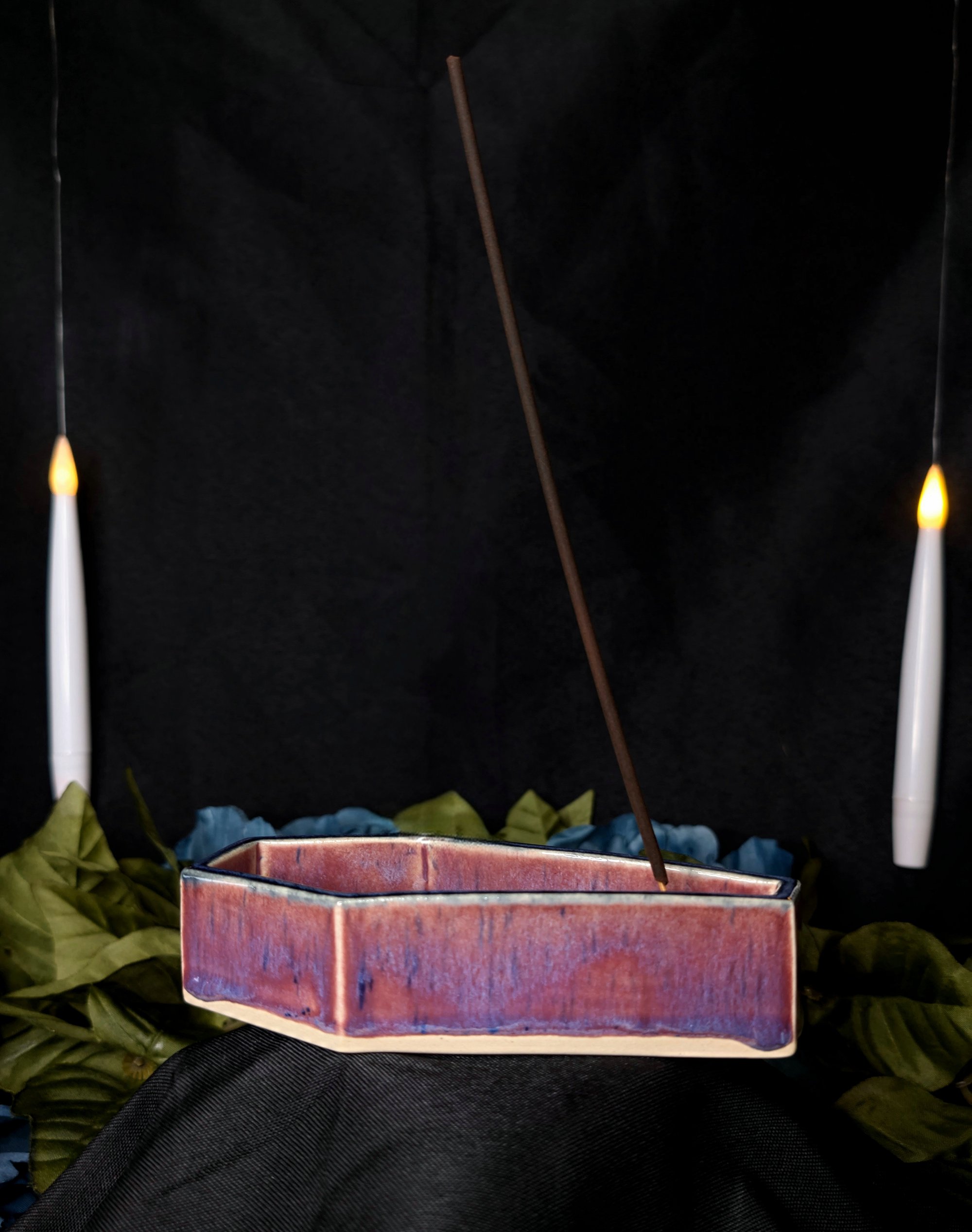 Slab built coffin incense burner with an underglaze transfer of a snake and moon phases. Glossy amethyst glaze on interior and exterior walls.