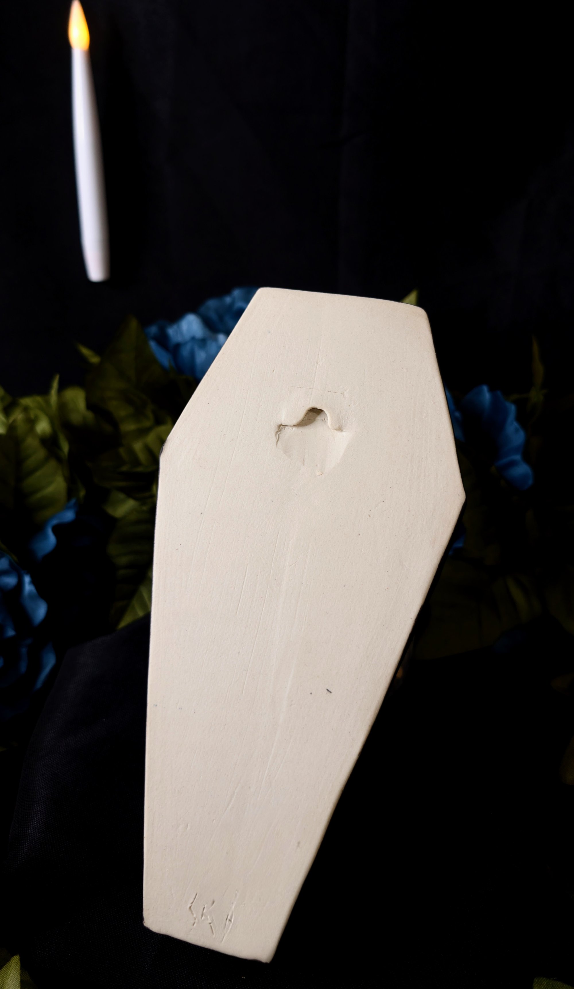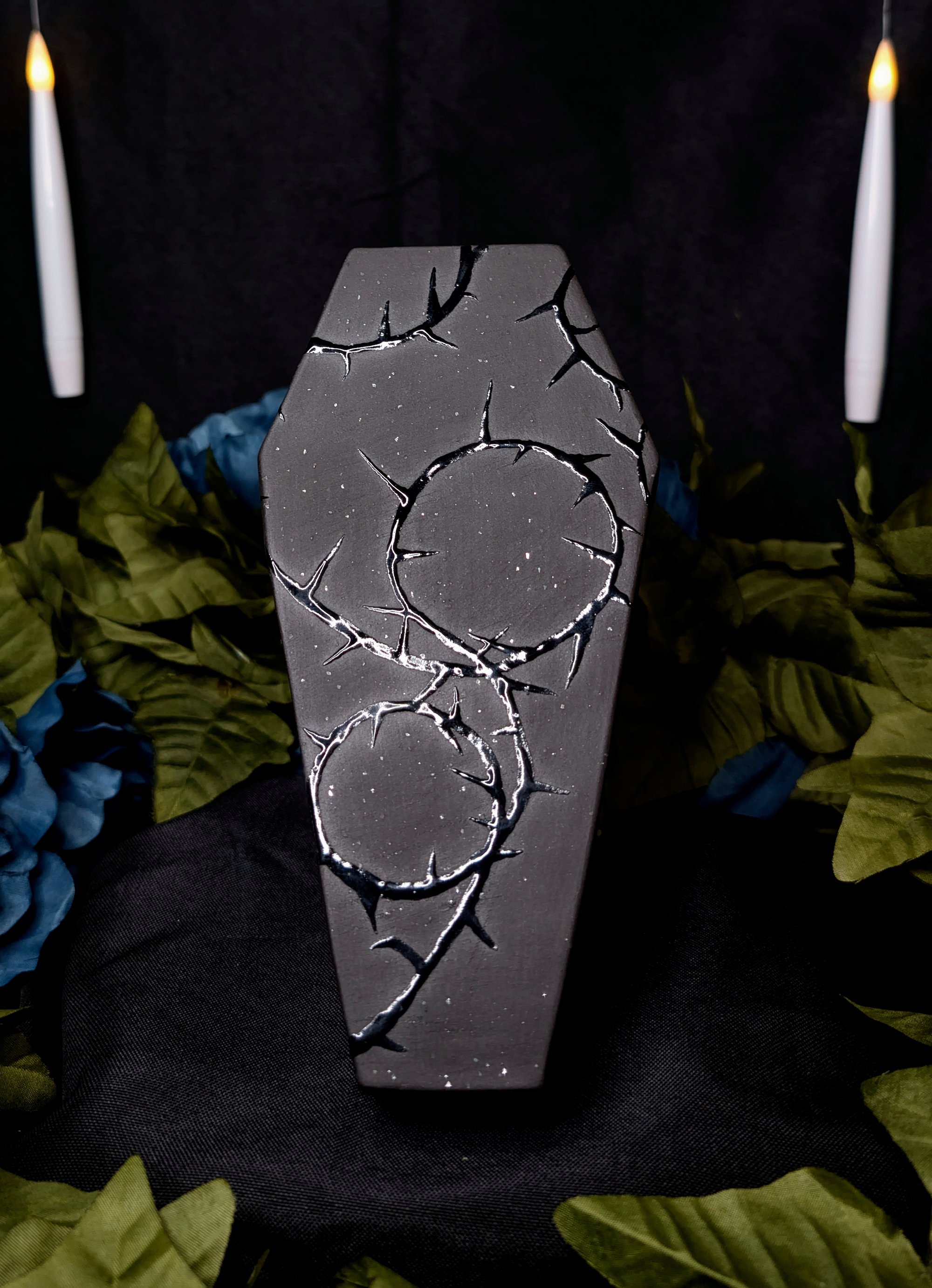 Slab built coffin wall planter with an open top for baby plants or dried plants. Sparkly black matte engobe black exterior with glossy black thorns painted on.