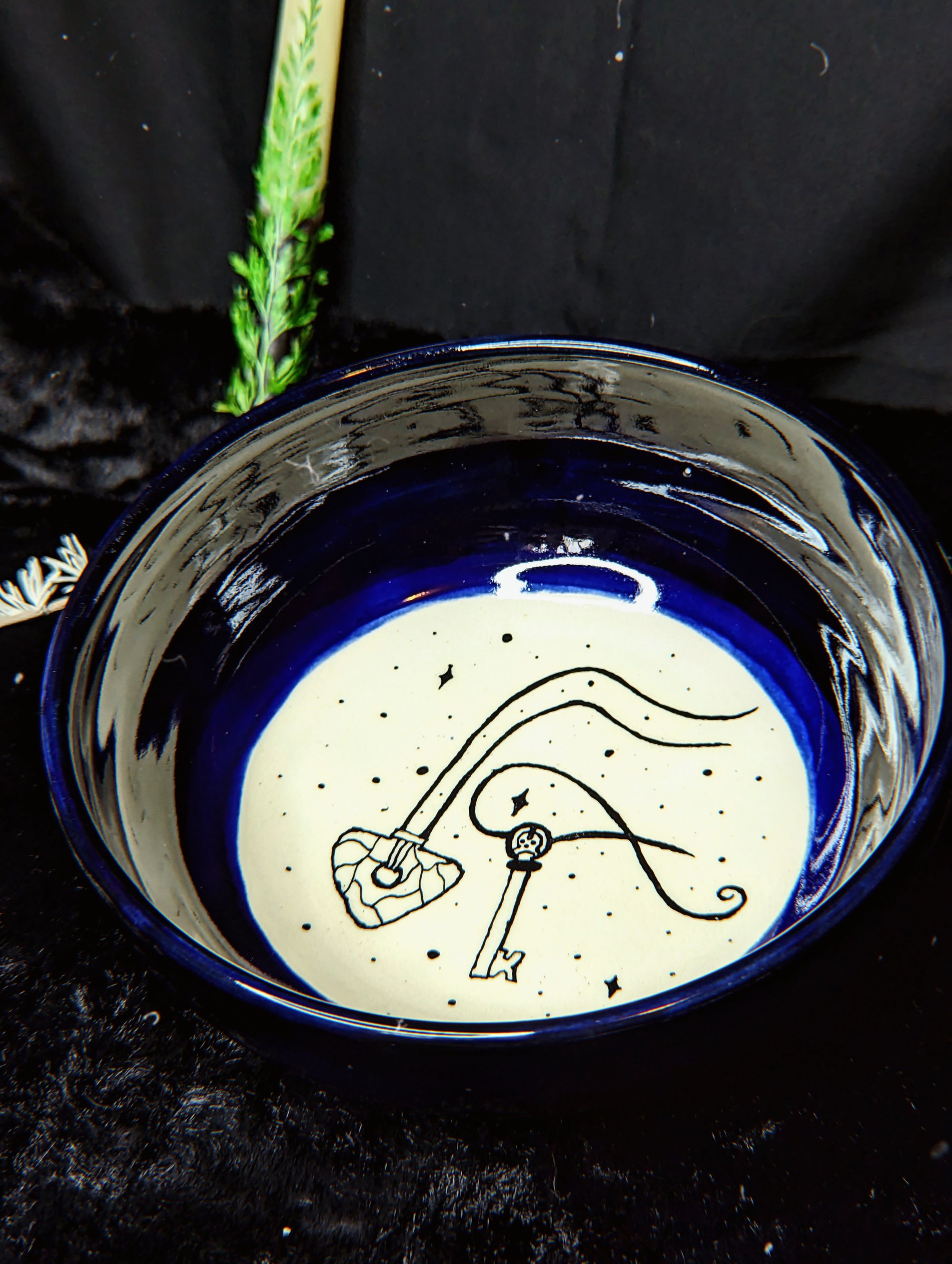 Small bowl with detailed hand drawn image of the keys to souls from the film "Coraline". Glazed inside and out with a deep blue glaze. Food safe and the perfect size for cereal, ice cream, or for trinkets.
