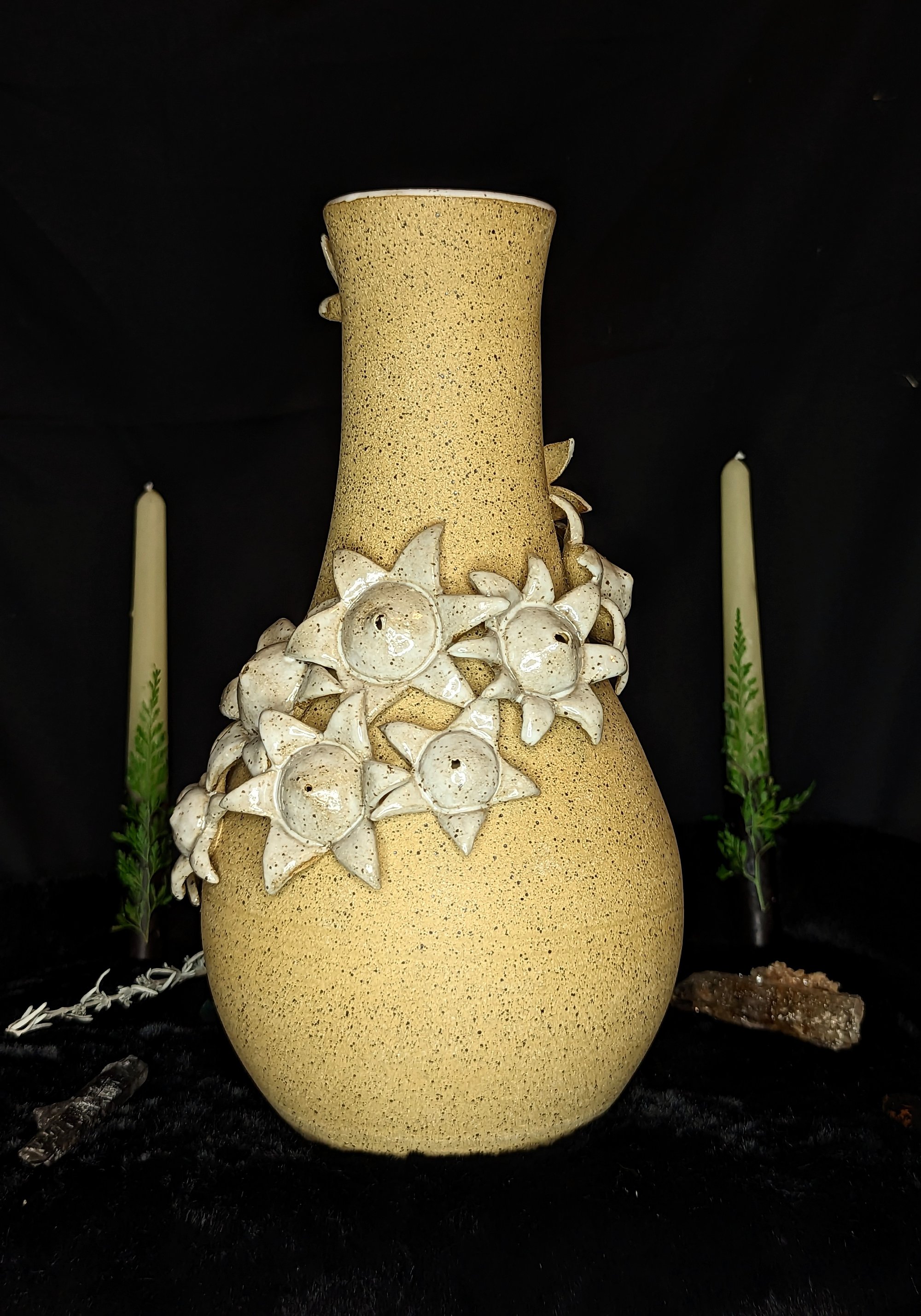 A large vase made from a beige speckled clay, adorned with hand crafted earth star mushrooms cascading down the piece. White glazed interior. Would be magical with flowers but makes a wonderful center piece or mantel piece for my mushroom lovers out there ✨