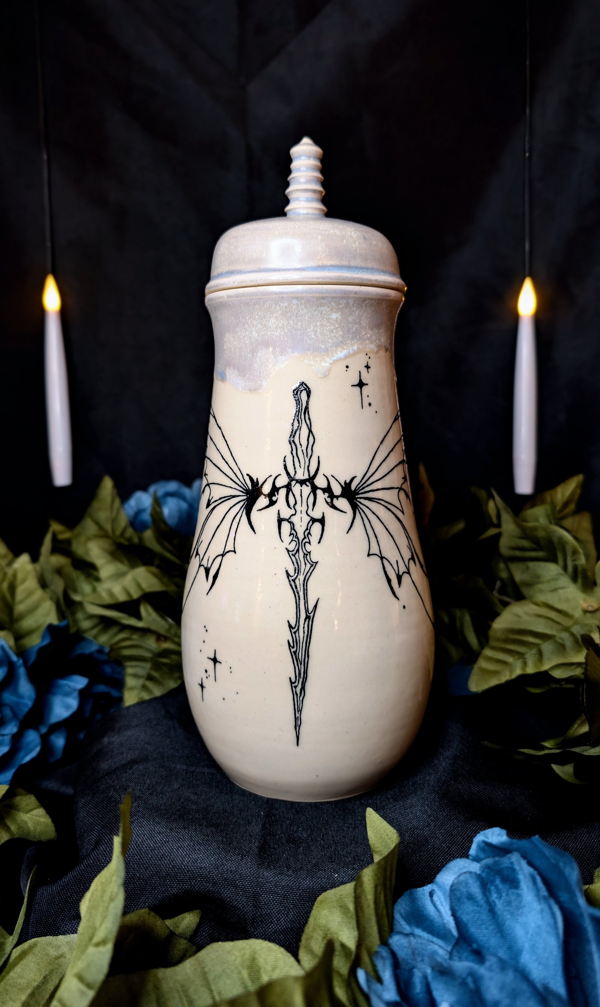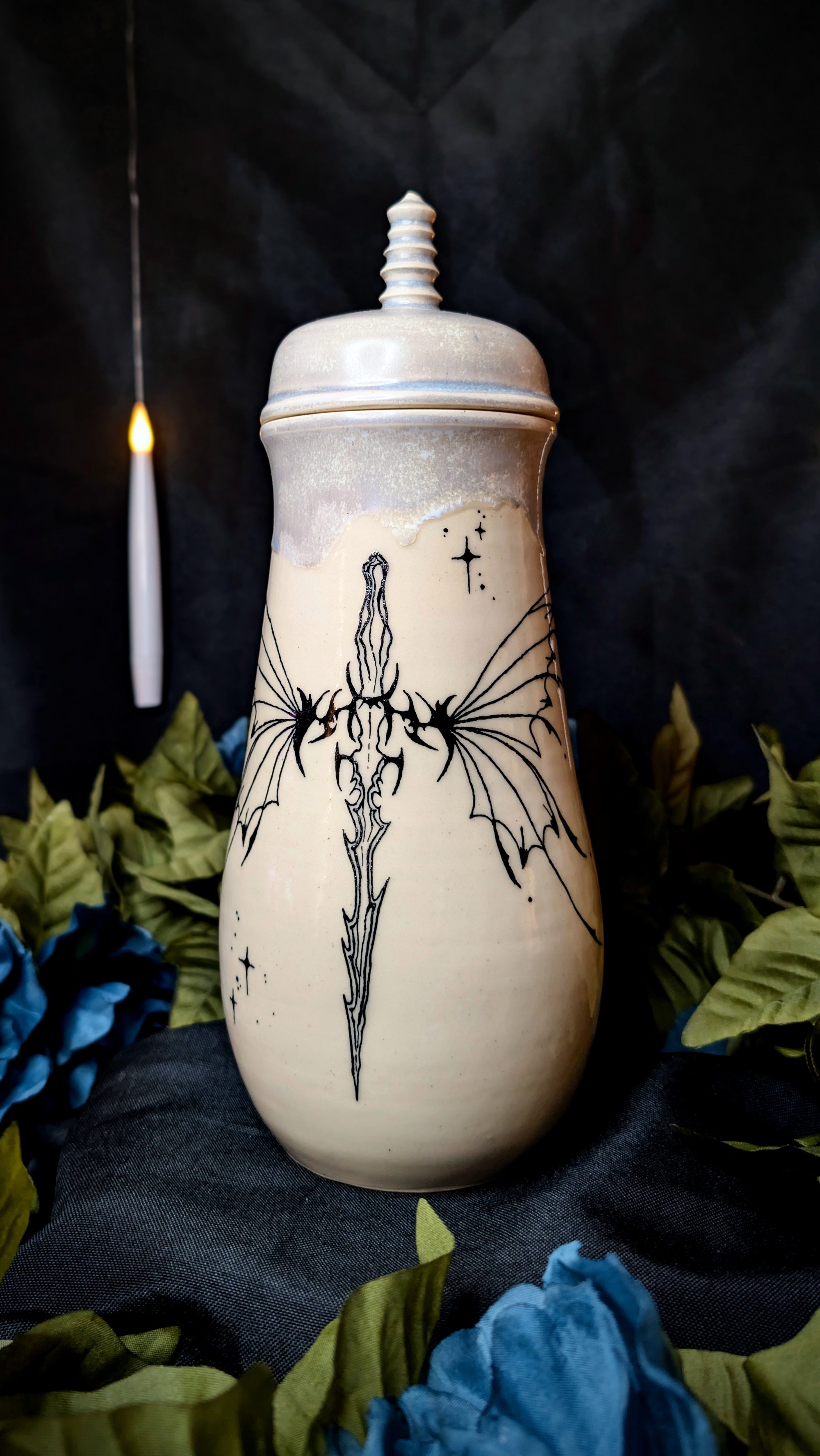 Tall jar with detailed, original hand drawn image of a sword and ethereal wings drawn directly onto the piece with a squeeze bottle of underglaze. Glazed with a magical purple blue crystalized glaze around image and on the lid, and white inside. Clear glaze was applied over the image after the initial firing. One of one, and completely niche.