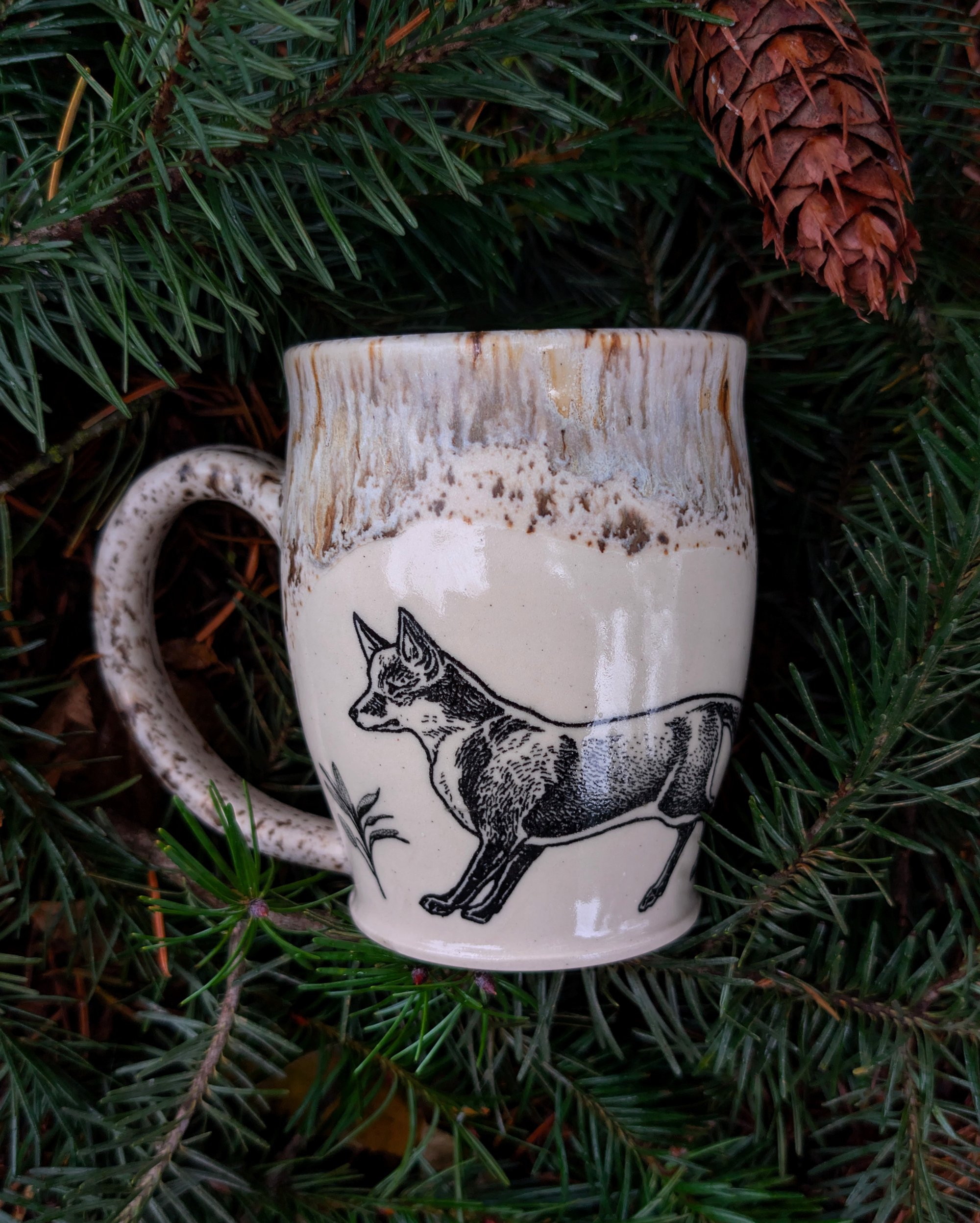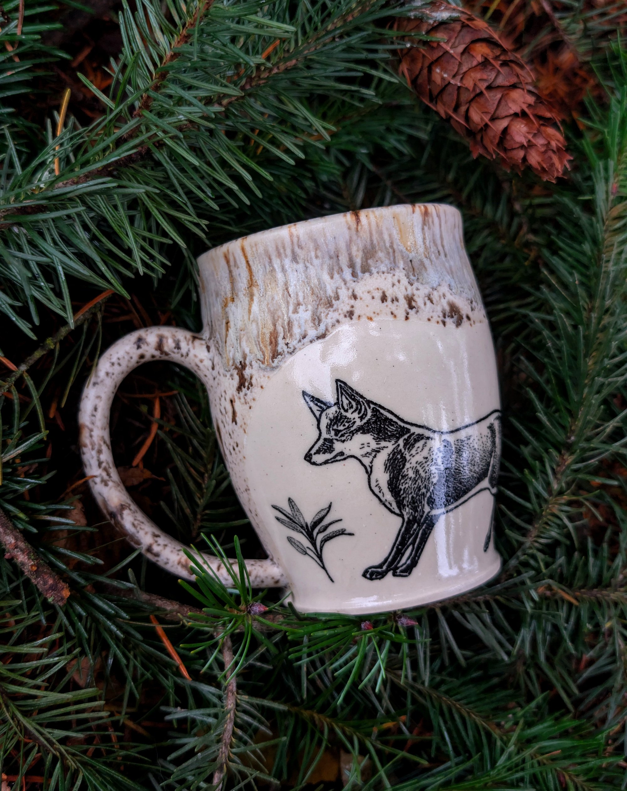 Bring a touch of winter forest magic to your daily rituals with this handcrafted ceramic mug. Made from durable stoneware, each piece is wheel-thrown and finished with a warm, earthy glaze that cascades down the rim like snow over wood. The surface features a transfer fox illustration paired with a sprig of woodland flora for a quiet, enchanted feel.