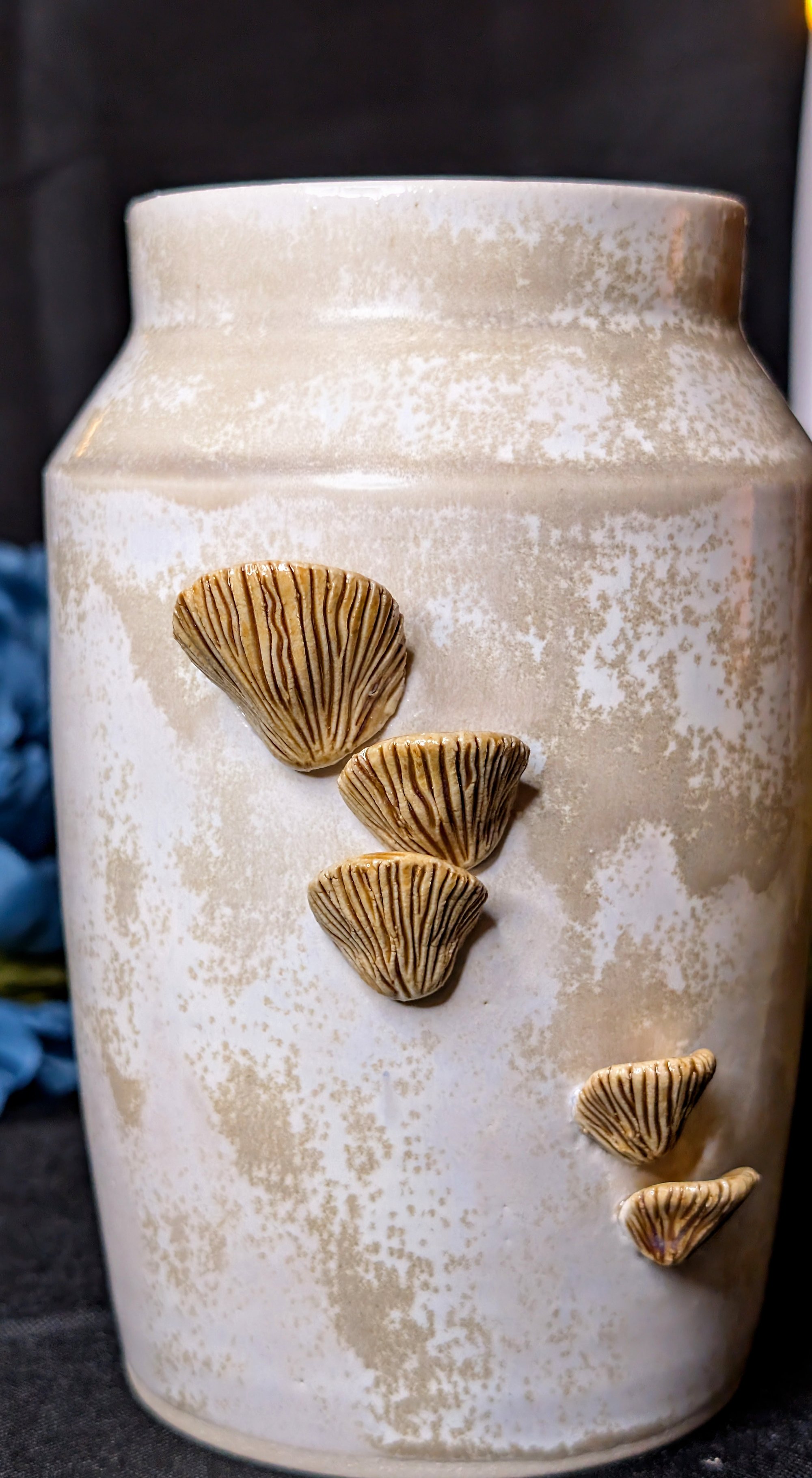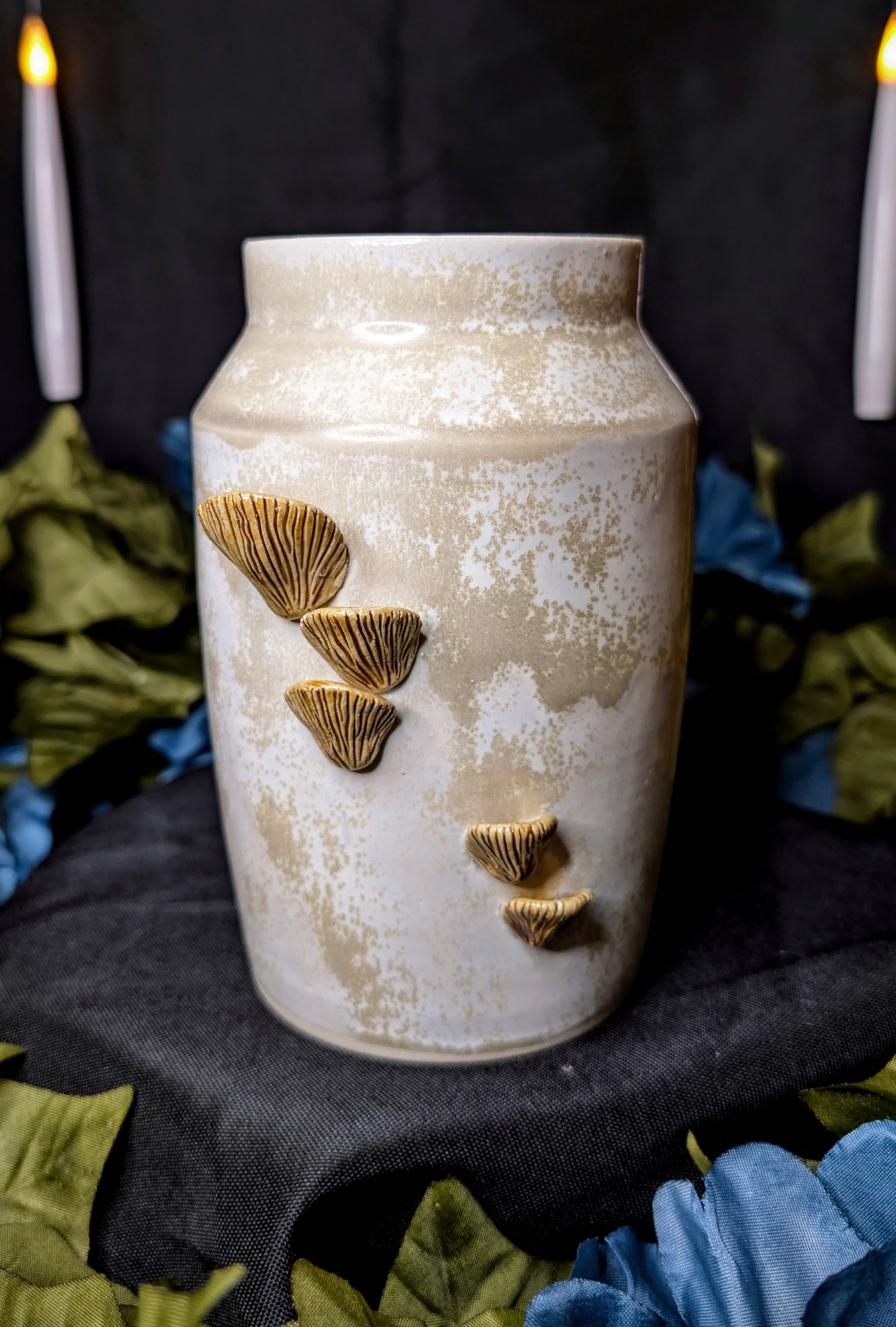 Small hand crafted amber mushrooms adorn this crystalline vase glazed with a micro pearl sheen. Perfect for dried flowers, a starter plants, or hand picked flowers.