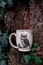 Bring a touch of forest magic to your daily ritual with this handcrafted ceramic mug. Made from durable stoneware, each piece is wheel-thrown and finished with a warm, earthy glaze that cascades down the rim like moss over stone. The surface features a transfer owl illustration paired with a sprig of woodland flora for a quiet, enchanted feel. Nestled among evergreen boughs and winter warmth, this piece carries a subtle nod to Yule, celebrating the returning light and the deep, wild stillness of the season.