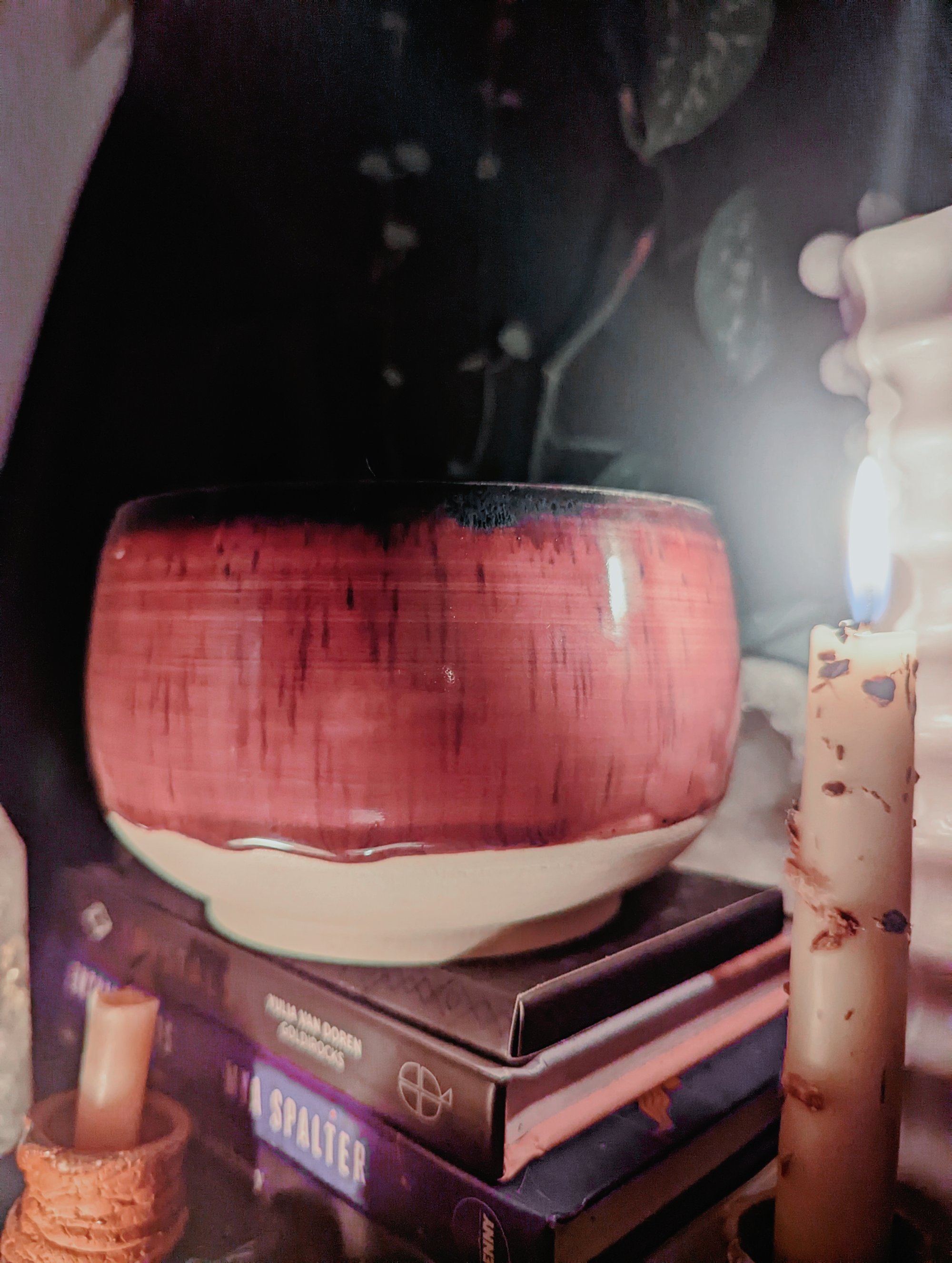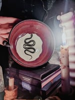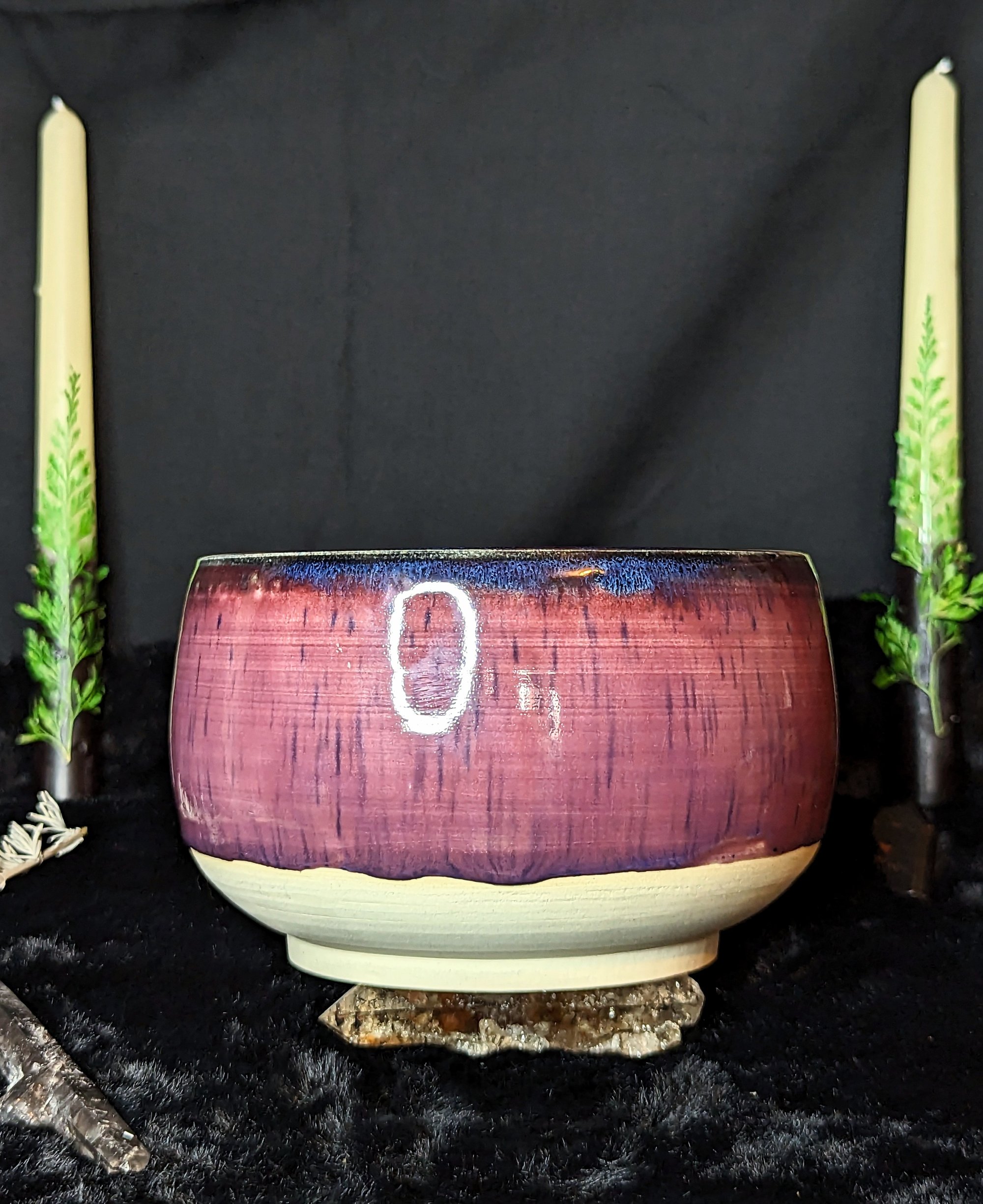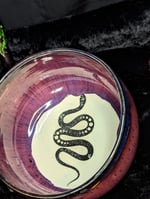 Wide bottom bowl decorated with a serpent and a speckled purple glaze, with a deep blue/black rim.