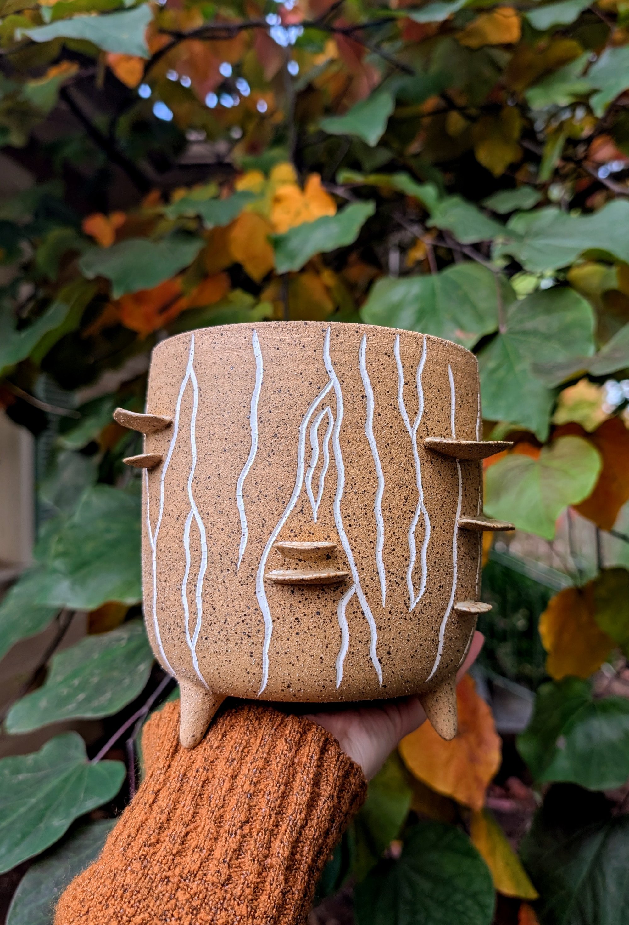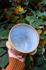 Hand crafted using a naturally speckled clay, this piece was then carved by best friend and potter, @pottery_by_abigail and adorned with mushrooms by me. The carvings were then filled in with underglaze after it's first firing and glazed a crystalized pearl color on the tops of the mushrooms and blue/white on the interior. Photos do not do this piece justice, there are crystals and iridescence within the glaze that a camera simply can't show off!