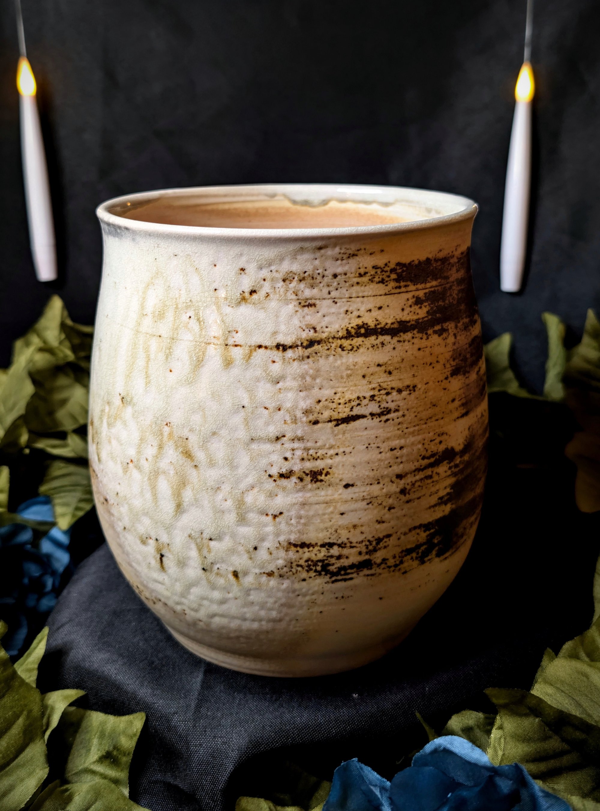 Born from flame and earth, this vessel carries the memory of fire, ash, and raw land. Crafted with wild clay gathered and refined by hand, its surface holds the subtle grit and soul of the place it came from — minerals, roots, and ancient sediment fused into form. The woodfire process gave it life: stoked over many hours, fed with burning timber, and touched by living flame. Ash floated through the kiln and settled gently across the surface, melting into a natural glaze that kissed the clay with smoky sweeps and ember-dark flecks.