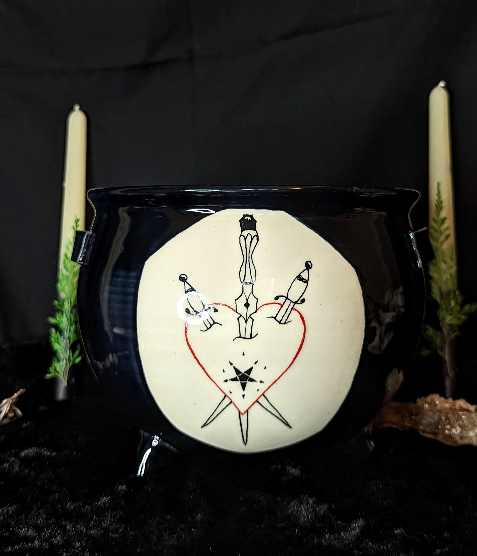 Medium sized planter decorated with a hand drawn image of a heart and three swords. Black glazed exterior and cauldron handles. Features a small drainage hole for happy plants. Tri-footed