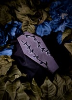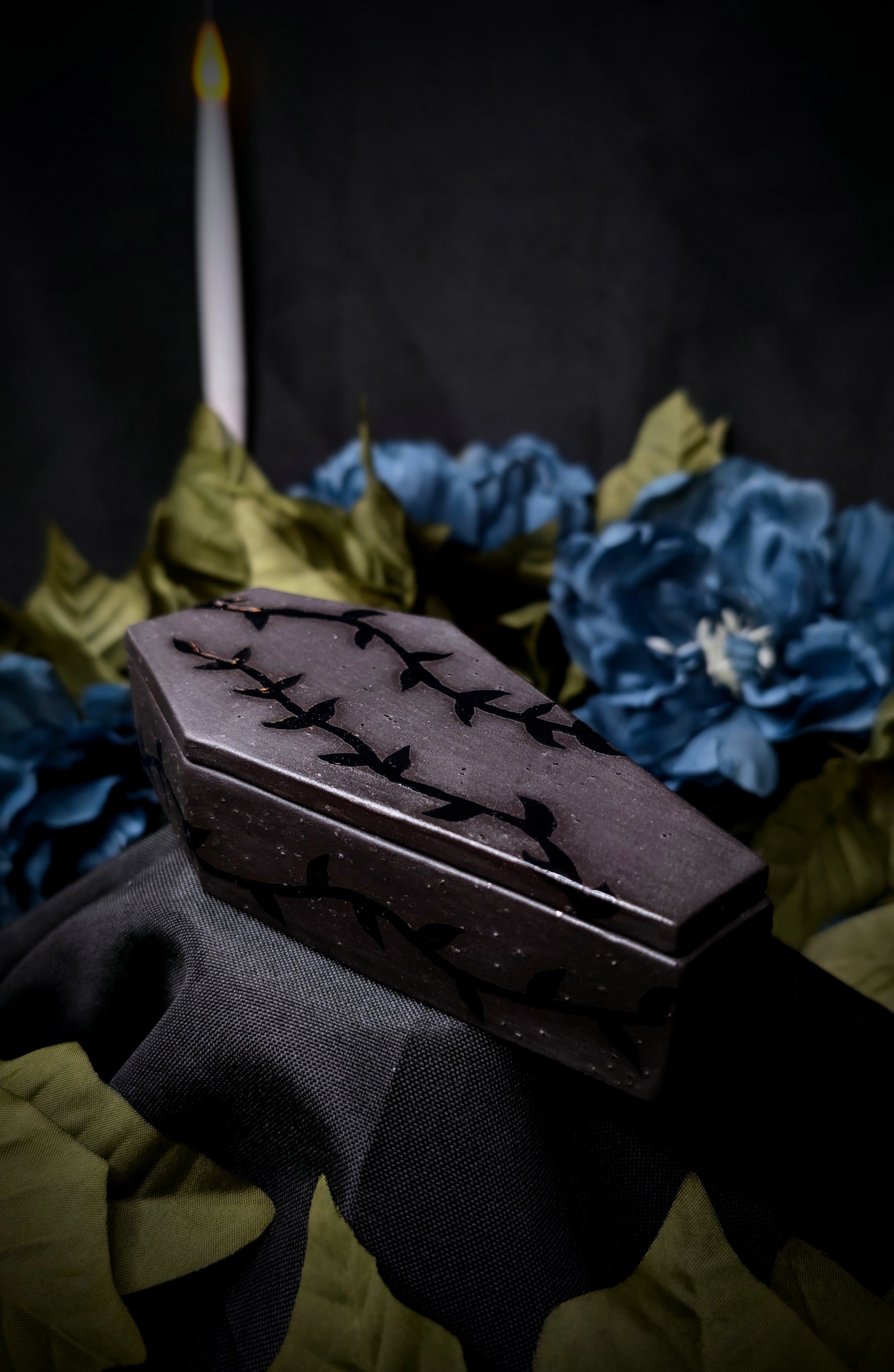 Slab built coffin jar with a sparkly matte black engobe covering the surface inside and out, and a glossy black vine accent on top of the lid and down the sides.