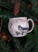 Bring a touch of forest magic to your daily ritual with this handcrafted ceramic mug. Made from durable stoneware, each piece is wheel-thrown and finished with a warm, earthy glaze that cascades down the rim like moss over stone. The surface features a transfer wolf illustration paired with a sprig of woodland flora for a quiet, enchanted feel. Nestled among evergreen boughs and winter warmth, this piece carries a subtle nod to Yule, celebrating the returning light and the deep, wild stillness of the season.