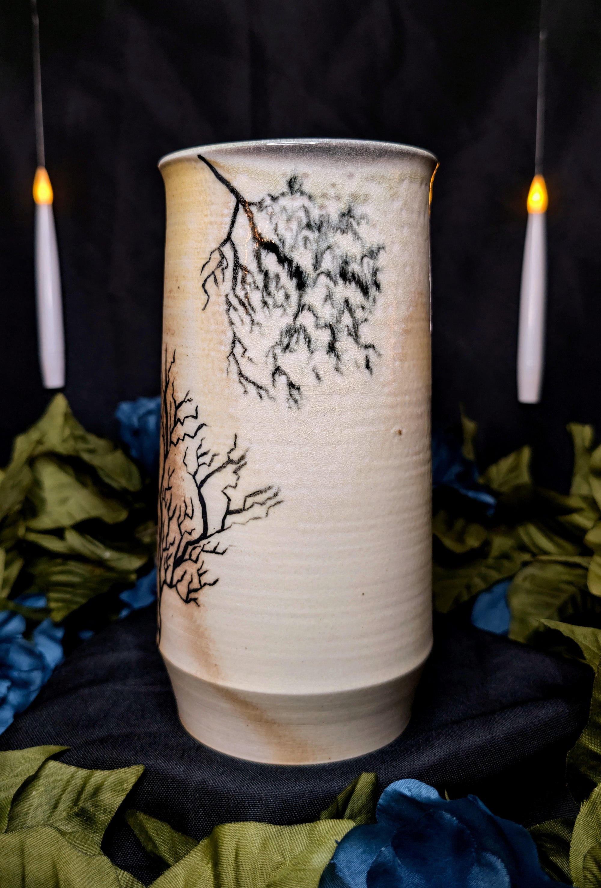 Wood-soda fired in a catenary arch kiln nicknamed "chicken cat", this vase harnesses natures elements fully - water and earth in the making process, fire in the finishing process and air in the 2 week cooling process. This piece fired in a wood-fueled kiln for 3 days, and no glaze was applied to the shelf before firing. All surface color and decoration you see is from melted wood ash and soda ash, and materials within the clay coming to the surface through the alchemical process of firing, except for hand drawn lightning image which was applied at the leather hard stage.